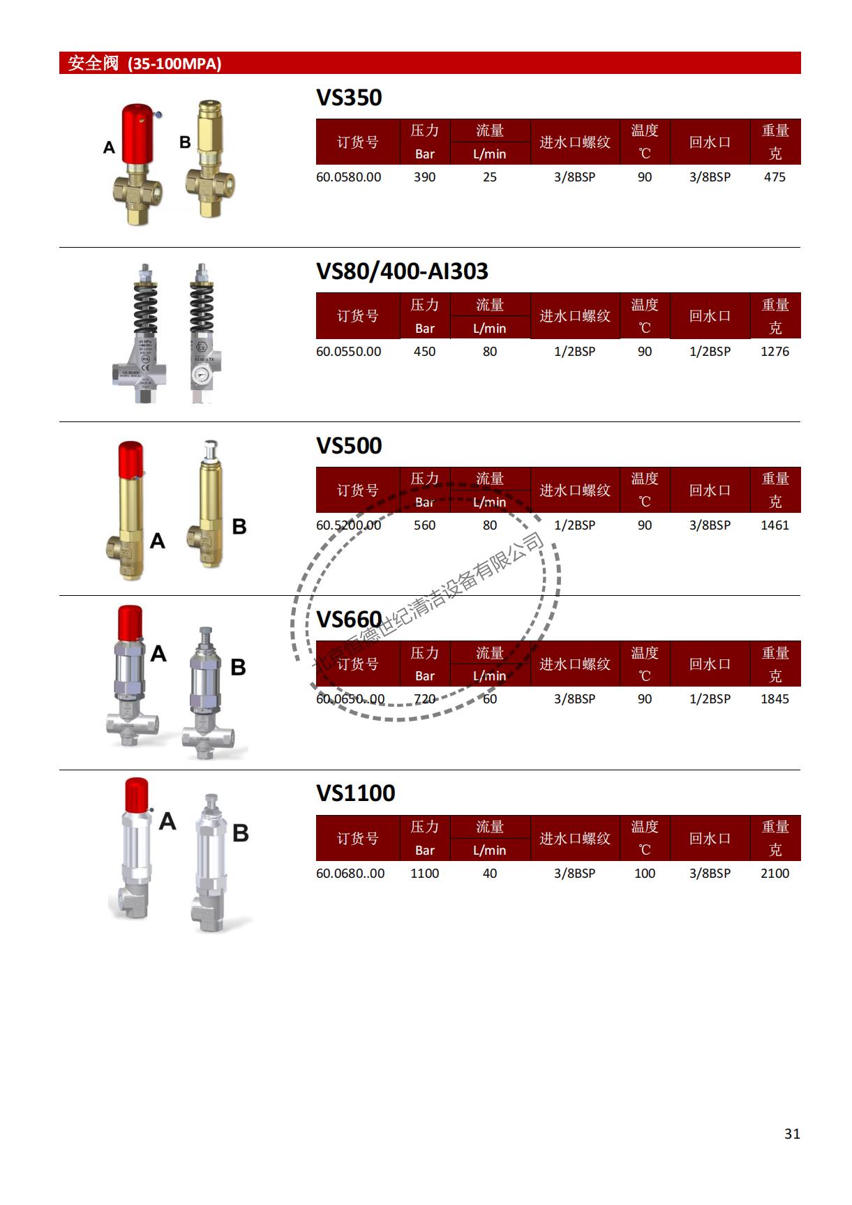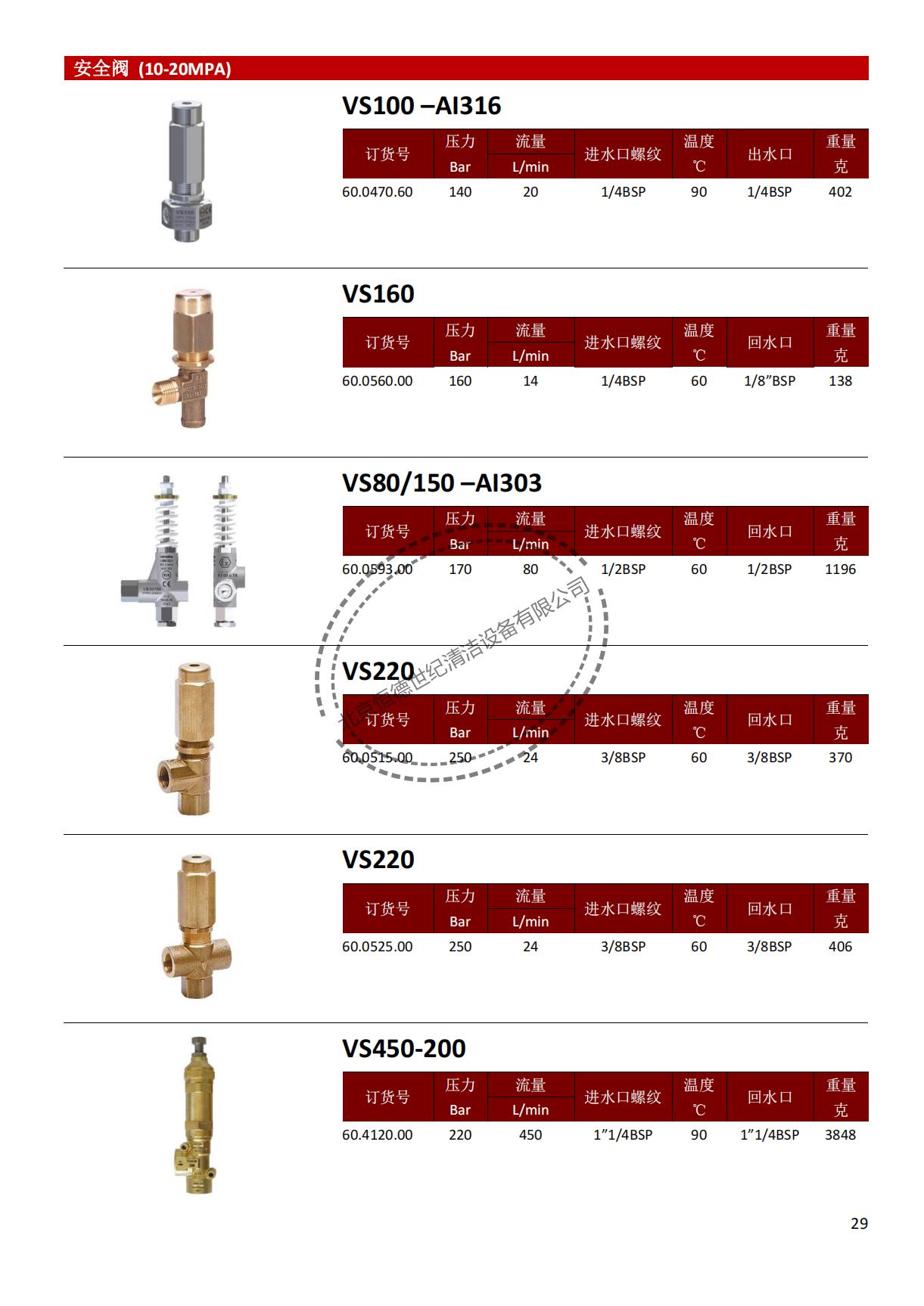 公司销售意大利PA清洗配件分为几大系列:VB调压阀系列,VS安全阀系列,VRP稳压阀系列,VRPP气动稳压阀系列,RP气动开关阀系列,RF脚踏阀系列,RB低压喷枪系列,RL高压喷枪系列,UR旋转喷嘴系列,ST单孔喷嘴系列,TS水喷砂清洗喷嘴系列,RR-TF管道旋转喷嘴系列,PR压力开关系列等